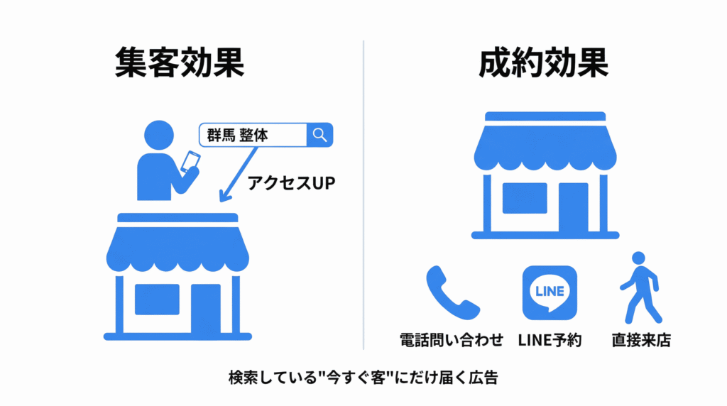 「地域名+業種」で検索している、今すぐ来店したいお客様にピンポイントで広告を届けられるからです。