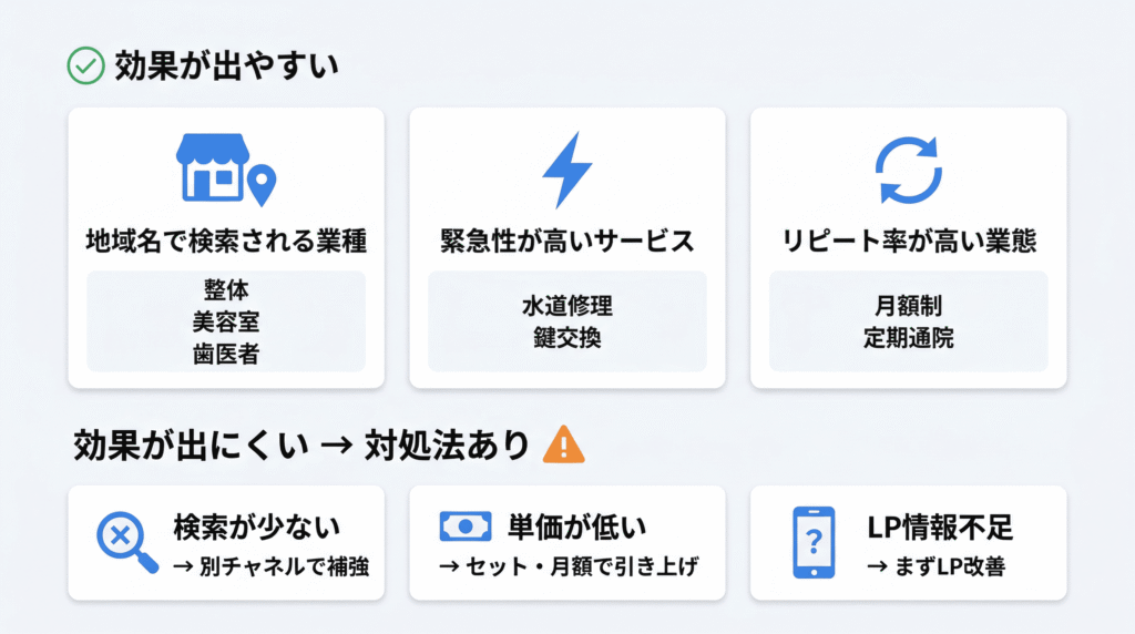 - 効果が出やすい店舗の特徴 → 地域密着型・緊急性が高い・リピート率が高い業種
