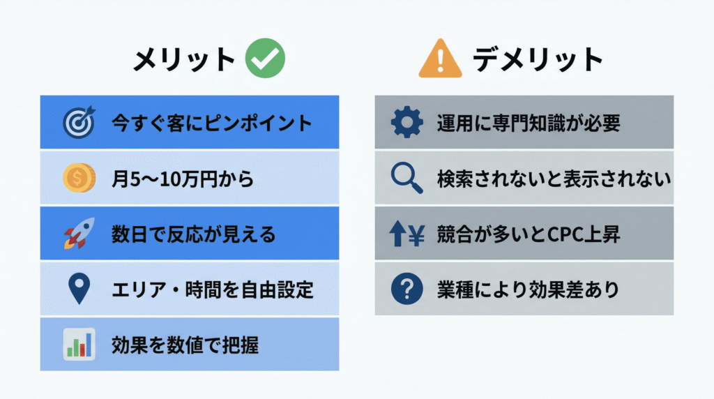 リスティング広告の効果がイメージできたところで、次に気になるのは「じゃあデメリットはないの?」という点だと思います。