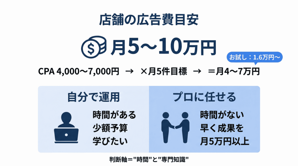 ここでは店舗ビジネスの実情に合わせて、現実的な費用感と、自分で運用するかプロに任せるかの判断基準をお伝えします。