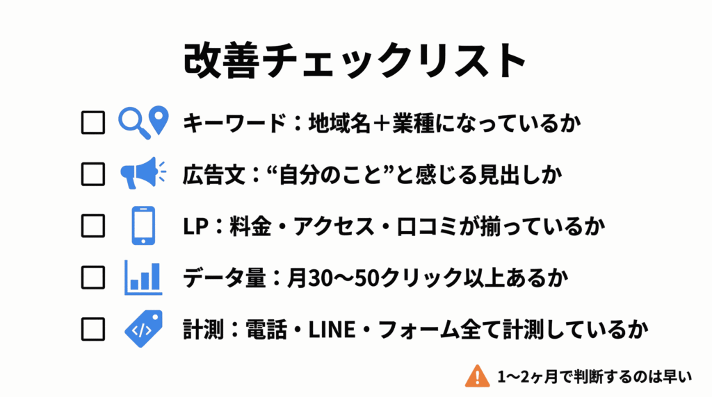 リスティング広告を始めて数週間〜1ヶ月ほど経つと、「思ったより問い合わせが来ない」「本当に効果あるの?」と不安になることがあります。