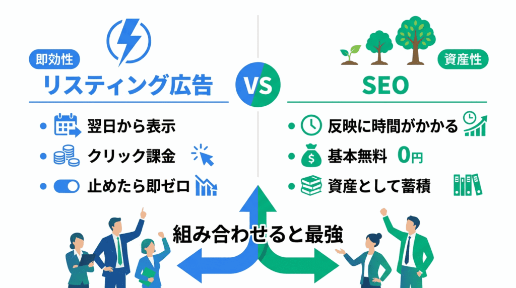 リスティング広告は「今すぐ成果を出したい」ときに強く、SEOは「長期的に安定した集客をつくりたい」ときに強い。