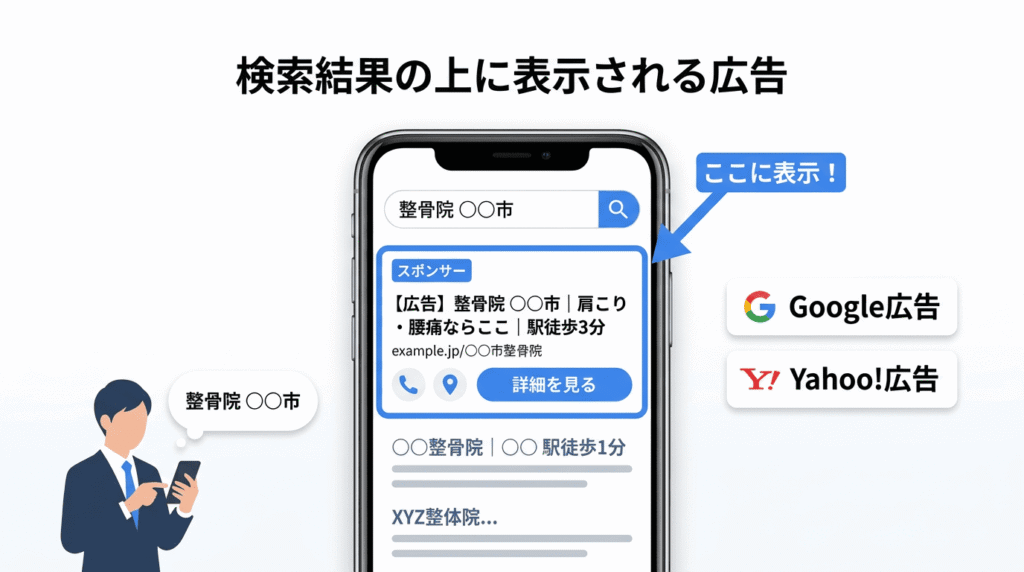 「整体 ○○市 予約」「美容院 駅前 当日」といったキーワードで検索した人、つまりすでに来店・予約を検討しているお客さんにだけ広告が表示されます。