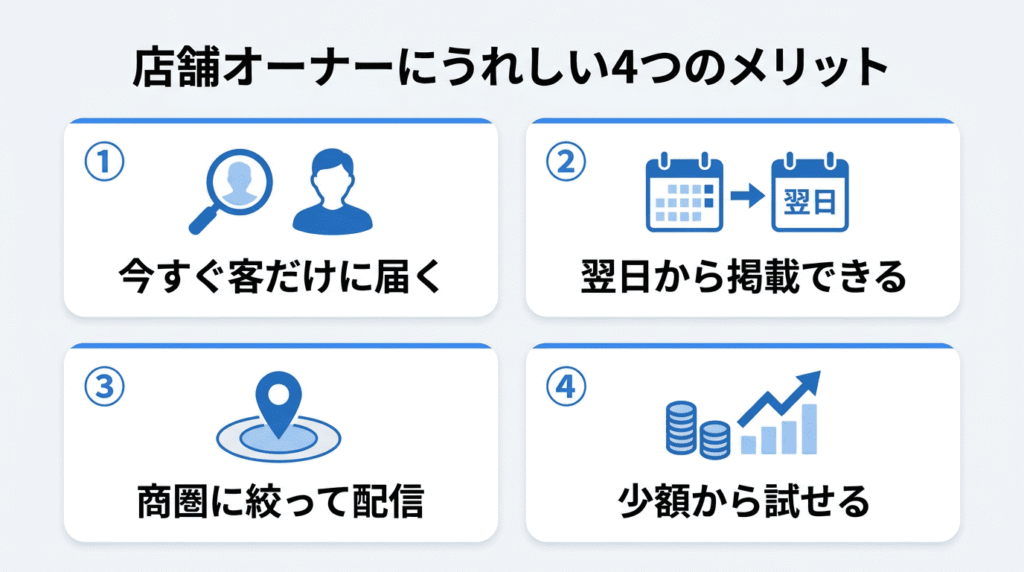 - メリットは即効性・地域絞り込み・少額スタート・データ改善の4つ