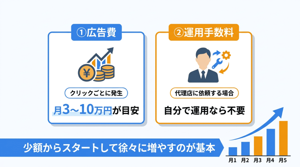 ①広告費:GoogleやYahoo!に支払うクリック課金の費用です。 クリックされるたびに発生し、1日の上限予算を自分で設定できます。