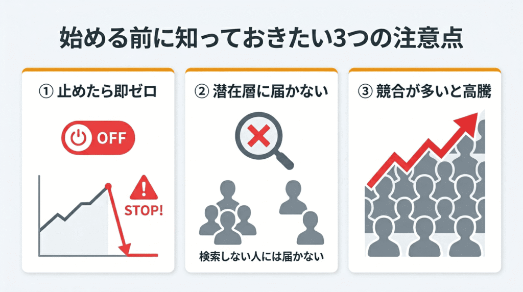 - デメリットは止めたら即ゼロ・潜在層に届かない・競合増で費用高騰の3つ