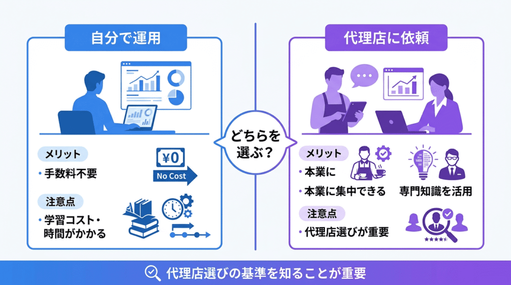 リスティング広告を始めようと決めたとき、次に迷うのが「自分でやるか、プロに任せるか」という選択です。