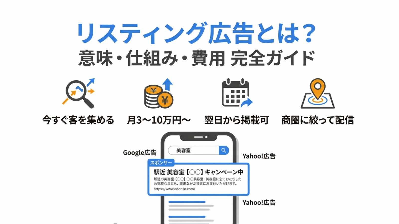 リスティング広告とは、GoogleやYahoo!の検索結果に表示されるテキスト広告のことです。