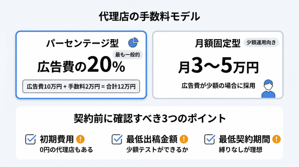 - 代理店の手数料は広告費の20%が相場。初期費用・最低出稿金額・契約期間の縛りは事前に確認する