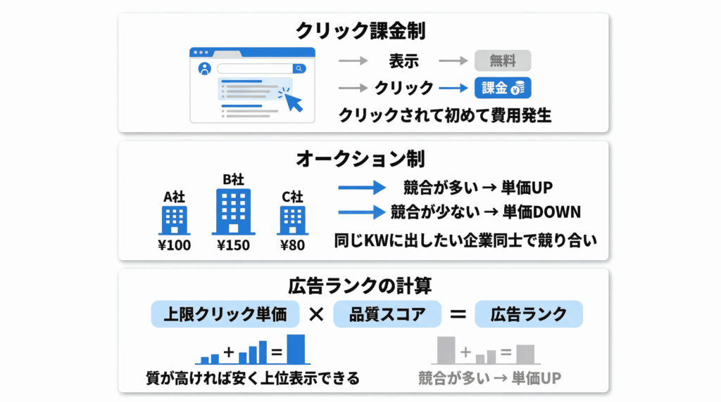 - 費用は「クリック課金制」×「オークション制」で決まり、品質スコアが高ければ安く上位表示できる