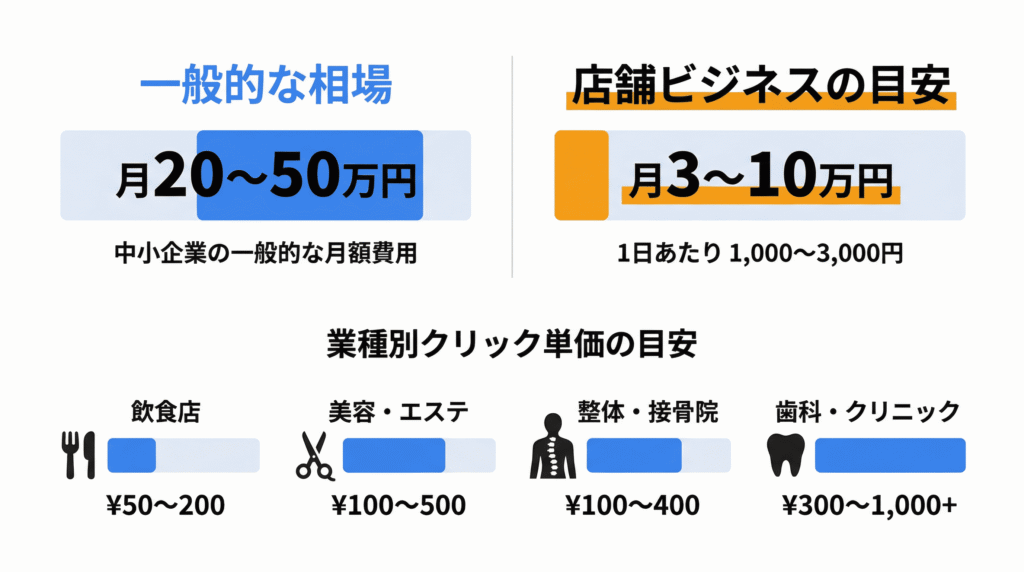 - リスティング広告の一般的な相場は月20〜50万円。店舗ビジネスなら月3〜10万円が現実的な目安
