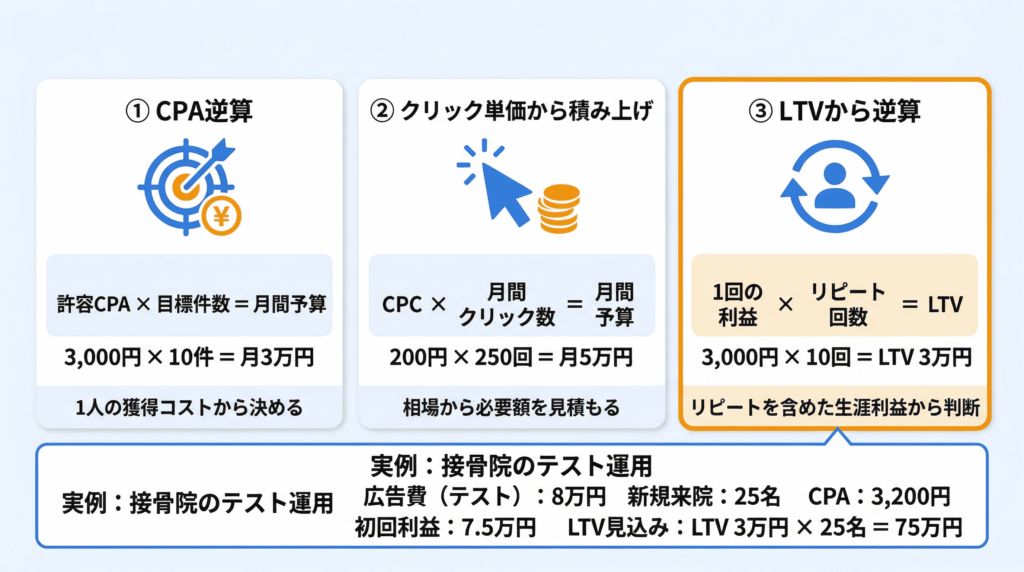 - 予算は「CPA逆算」「CPC積み上げ」「LTV逆算」の3パターンで決める