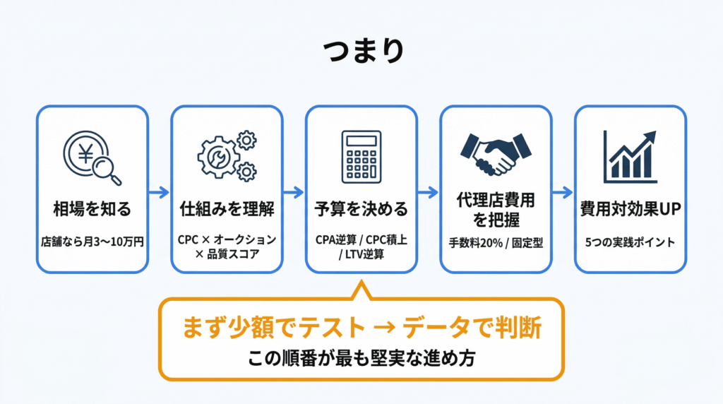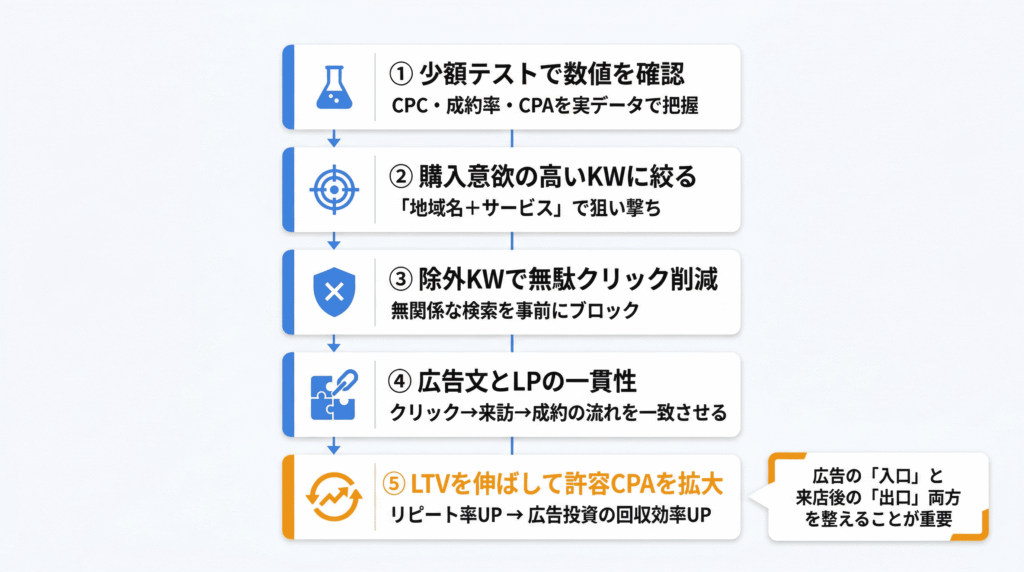 - 少額テスト・KW絞り込み・除外KW・LP一貫性・LTV向上の5つで費用対効果を最大化する