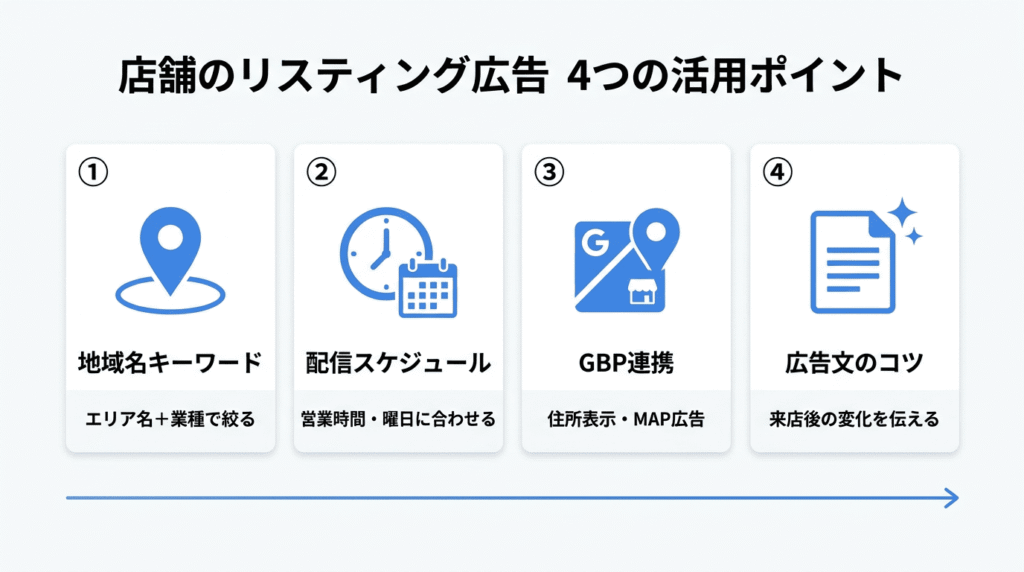 - 店舗ビジネスで押さえるべき4つの活用ポイント → 地域名KW・営業時間配信・GBP連携・広告文のコツ