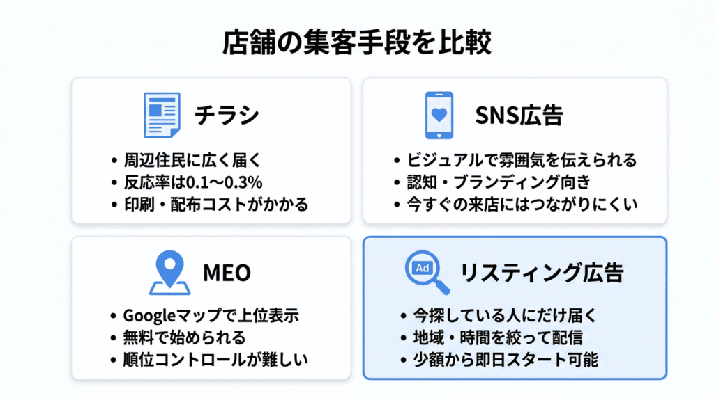 - リスティング広告は「今お店を探している人」にピンポイントで届く手段。チラシ・SNS・MEOとは役割が違う