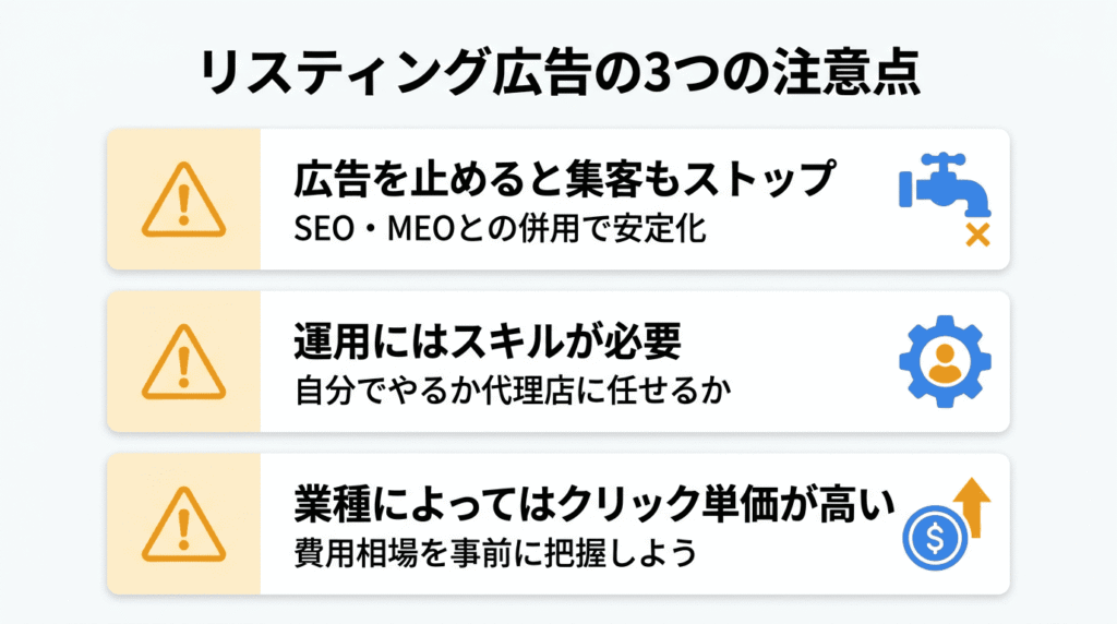 - 「止めたら集客も止まる」「運用スキルが必要」「CPC高騰リスク」の3つは事前に把握しておく