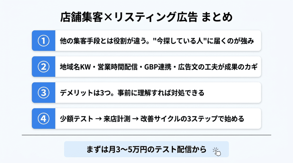 - まず月3〜5万円の少額テストで始め、来店計測の仕組みを入れ、3ヶ月のデータで改善サイクルを回す