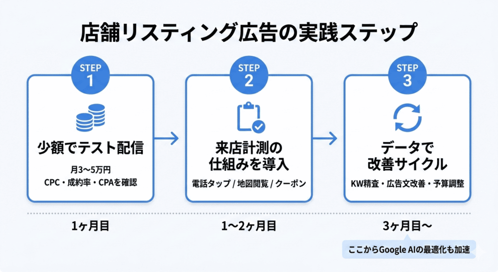 - まず月3〜5万円の少額テスト → 来店計測の仕組みを導入 → 3ヶ月のデータで改善サイクルを回す